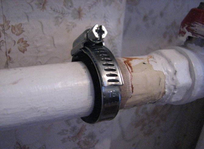 La section du tuyau endommagé est enveloppée d'un joint en caoutchouc spécial ou d'un bandage en caoutchouc sur lequel une pince métallique est placée.