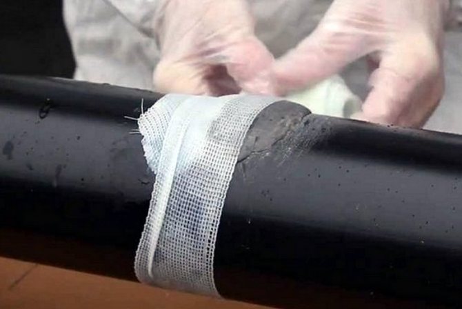 Pour l'emballage, un bandage de gaze ordinaire convient, qui doit être abaissé dans un récipient avec de la résine époxy (vendu dans les quincailleries du département peinture et vernis). Le tuyau est enveloppé de plusieurs couches, si nécessaire, il est en outre fixé avec du fil.