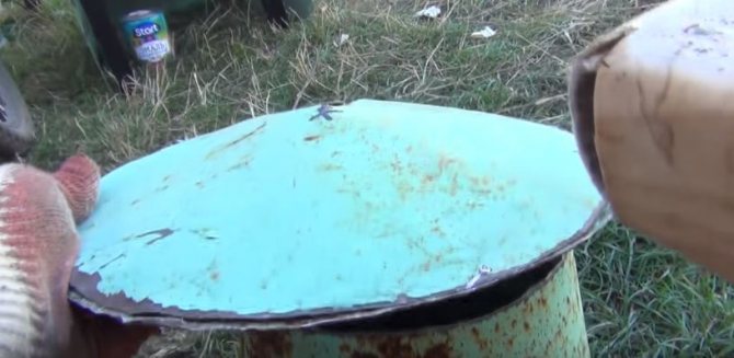 Étape 1. Transférer les dimensions des composants de l'appareil sur le métal. Pour ce faire, dessinez deux cercles et deux arcs des diamètres indiqués sur la surface. Il est préférable de le faire à l'aide de la boussole spéciale du ferblantier. Sinon, pas de problème. Enfoncez un clou au centre du métal, attachez-y un feutre ou un crayon avec un fil, la longueur du fil est égale au rayon du cercle. Un tel dispositif élémentaire fonctionne très bien et a été testé par la pratique. Découpez les blancs avec des ciseaux en métal.
