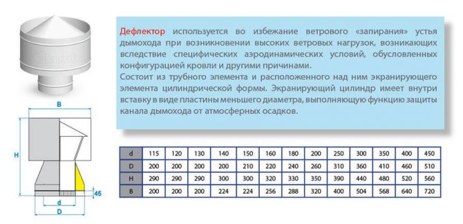 Un déflecteur est un dispositif qui permet à l'air de circuler ou de passer à travers un canal de rétrécissement, dans lequel une zone de raréfaction apparaît immédiatement près de l'embouchure de la cheminée. Les gaz sortant de la cheminée commencent à être aspirés dans la zone du gaz évacué. En conséquence, le vent, qui pourrait provoquer une suppression de la poussée, au contraire, commence à l'augmenter.