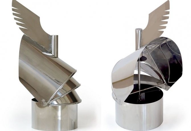 Une autre version du déflecteur de cheminée, qui est représentée par des visières reliées les unes aux autres, tournant en cercle.Pour assurer un mouvement constant sous l'influence des masses d'air, une girouette spéciale est installée dans la partie supérieure de la structure. De nombreux modèles sont équipés d'une petite épingle à flèche qui détermine la direction du vent.