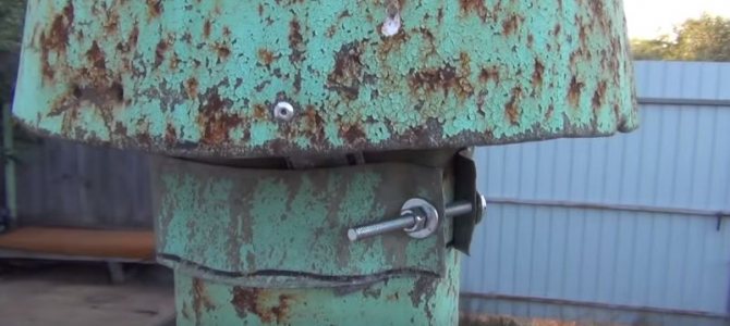 Pour installer le dispositif aérodynamique sur la cheminée, trois trous sont percés au même niveau. La structure est insérée dans le tuyau et boulonnée. Ensuite, le roulement, le cylindre, la girouette et le capuchon de protection sont assemblés sur l'essieu. Tout est fixé avec des rivets.