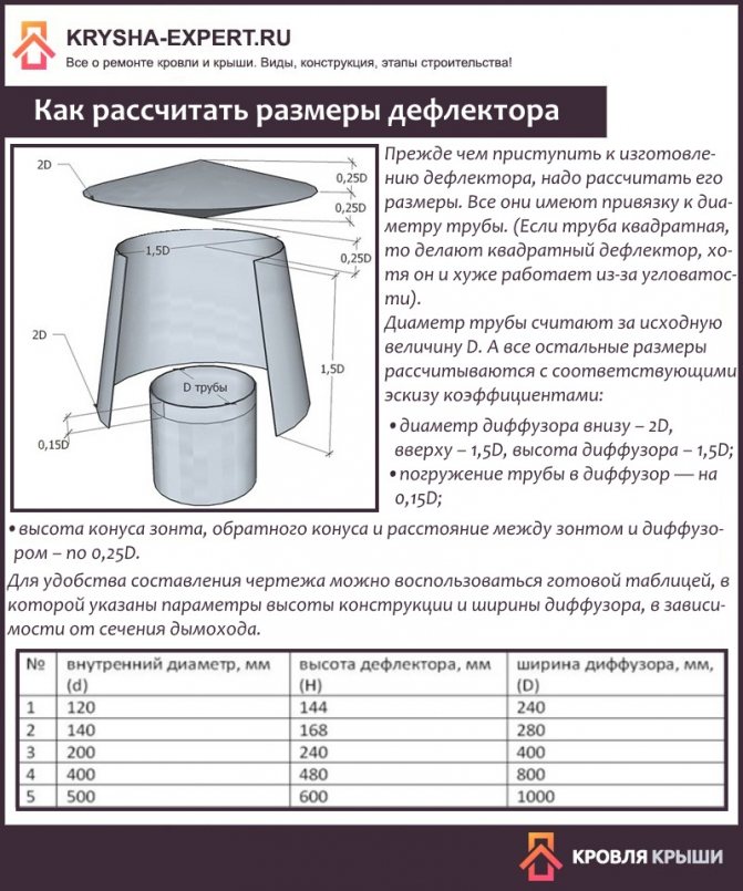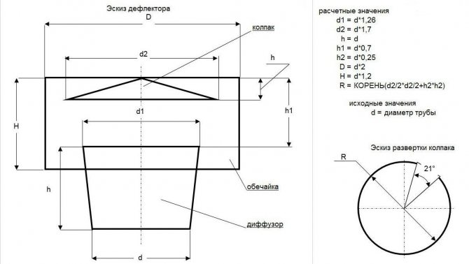 Important. Pour chaque diamètre de cheminée, il est nécessaire d'avoir des dimensions individuelles des composants du déflecteur. Il existe de nombreuses calculatrices en ligne sur le net, il n'est pas nécessaire de réécrire et d'utiliser des formules complexes. Toutes les dimensions sont données en fonction du diamètre de la cheminée ronde.