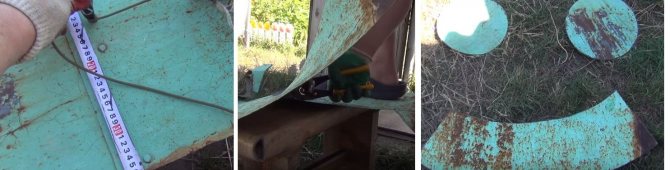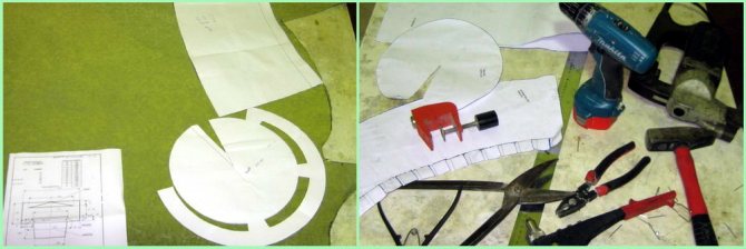 Étape 3. Calculez le secteur à couper pour plier les éléments ronds. Mais cela ne vaut pas la peine de le retirer, du métal supplémentaire est nécessaire pour se connecter avec des rivets pliés. Vous pouvez utiliser des formules et connaître l'angle de pliage, ou vous pouvez effectuer une coupe le long d'un rayon et, en pratique, sélectionner la vue optimale de l'élément. La deuxième option est beaucoup plus rapide et n'affecte en rien l'efficacité de l'appareil.