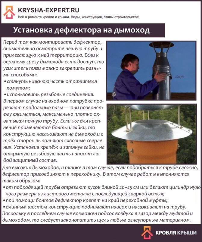 La méthode d'installation dépendra du tuyau de cheminée lui-même, sur lequel le déflecteur sera situé. Le plus souvent, pour une fixation solide, il suffit d'utiliser une paire de trous et une pince (et vous ne pouvez pas vous passer de percer des trous dans la cheminée elle-même). Si le matériau recouvrant le toit est hautement inflammable, vous devrez en outre acheter un pare-étincelles, qui doit être installé sur le déflecteur.