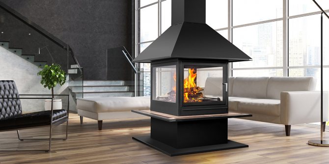 Les cheminées de l'île sont situées au milieu de la pièce, il est donc préférable de les construire dans des pièces spacieuses. Des foyers autonomes sont formés sur un podium surélevé. La cheminée peut être fermée ou ouverte.Le radiateur remplit principalement une fonction décorative, car sa puissance calorifique est minimale.