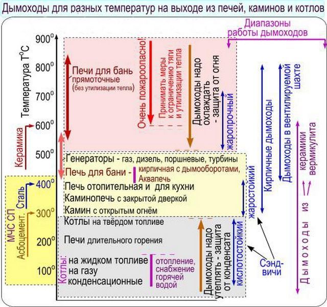 Schéma de la dépendance du type de chauffage, de la température dans la cheminée et du matériau de sa fabrication