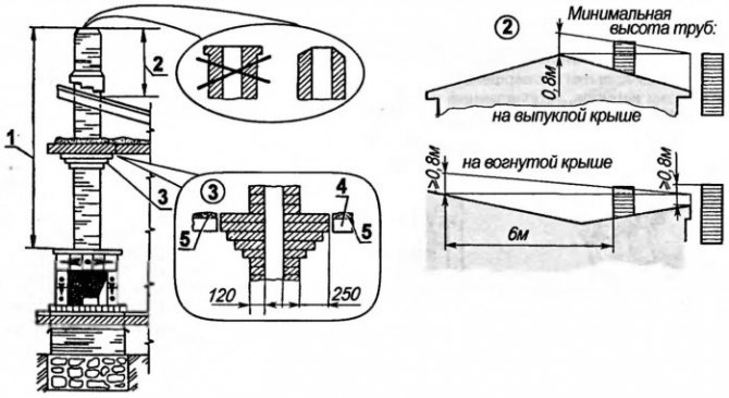 Cheminée de cheminée: 1 - Partie effective de la hauteur; 2 - Hauteur de l'appui-tête; 3 - Découpe; 4 - Chevauchement; 5 - Remplissage de sable.