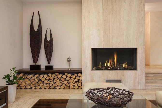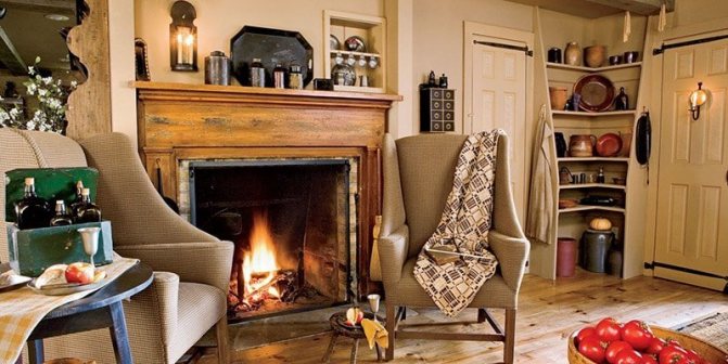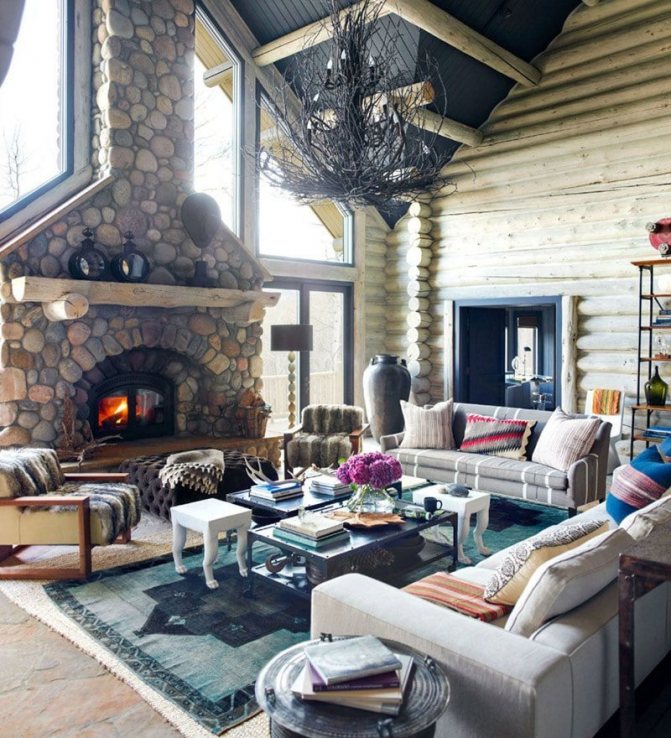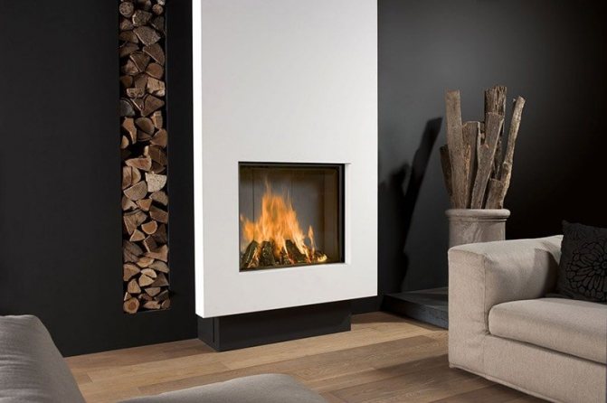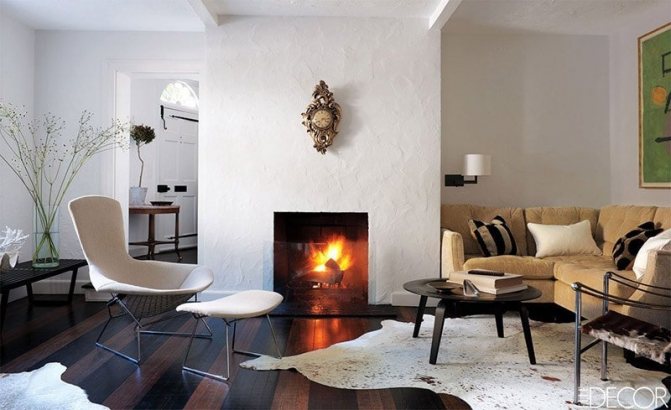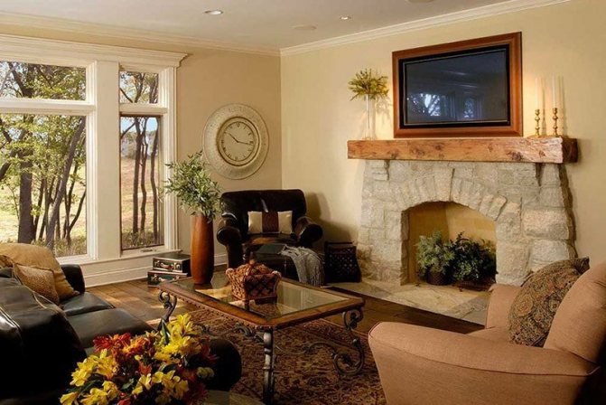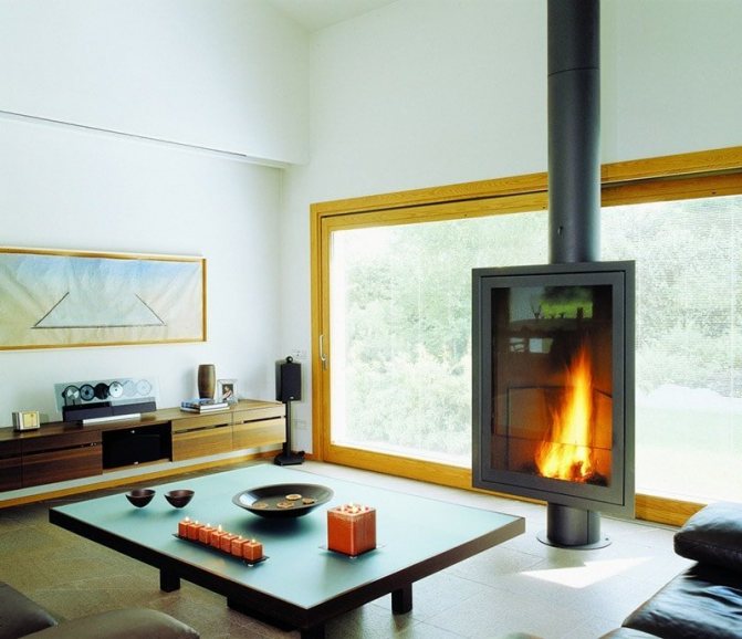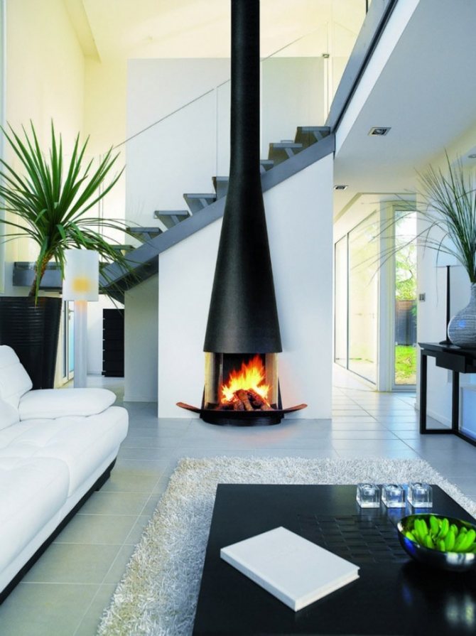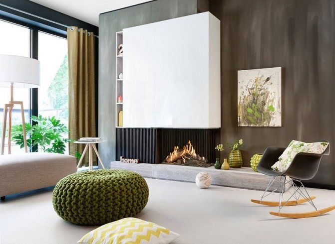 Avec une cheminée. Des cheminées dans des niches ou avec des portails spéciaux intégrés sont souvent installées au centre de la pièce. Les modèles angulaires sont moins courants. Il s'agit d'une option classique qui a fait ses preuves.