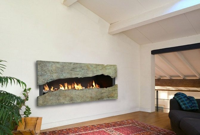 Plat. En règle générale, ce sont des bio-cheminées construites dans une niche ou une partie d'un mur. Un tel portail peut être encadré avec n'importe quel matériau - l'efficacité de la flamme n'en diminuera pas.
