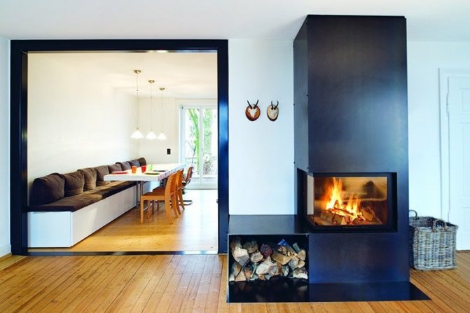 Pour les débutants dans le secteur des fournaises, vous pouvez envisager de simples poêles à foyer double face - des appareils avec une chambre de combustion traversante. L'avantage d'une telle structure peut être considéré comme la possibilité de chauffer deux pièces adjacentes à la fois. Il n'y a pas de passages complexes avec des virages et des pentes avec un certain angle - la cheminée monte tout droit, passant de la hotte collectrice de fumée au tuyau le long d'un trapèze.