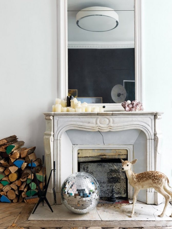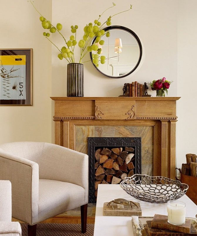 Le bois naturel et la pierre artificielle s'adaptent parfaitement à la plupart des styles. L'astuce réside dans la conception de la cheminée elle-même: grilles forgées, moulures en stuc, éléments sculptés, applique.