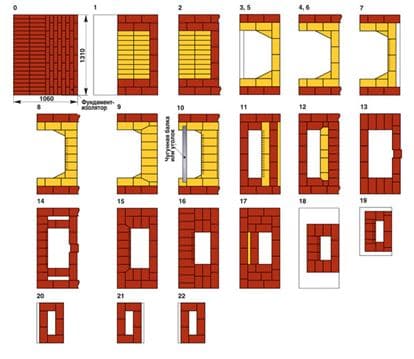 Tout poêle de cheminée est disposé selon un certain modèle. Il y a beaucoup de tels dessins, il est facile de calculer votre installation en les utilisant. Les dimensions linéaires du schéma sélectionné sont prises comme point de référence, qui s'adaptent à leur clinker de construction existant - les augmentent ou les diminuent proportionnellement. Le dessin suppose une visualisation ordinale de la maçonnerie. Après avoir calculé la quantité de matériau dans chaque rangée, ils vont au nombre total du maçon sur les pièces porteuses, réfractaires à la chambre de combustion, et sont également déterminés en fonction du besoin de linteaux et de plaques en acier.