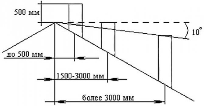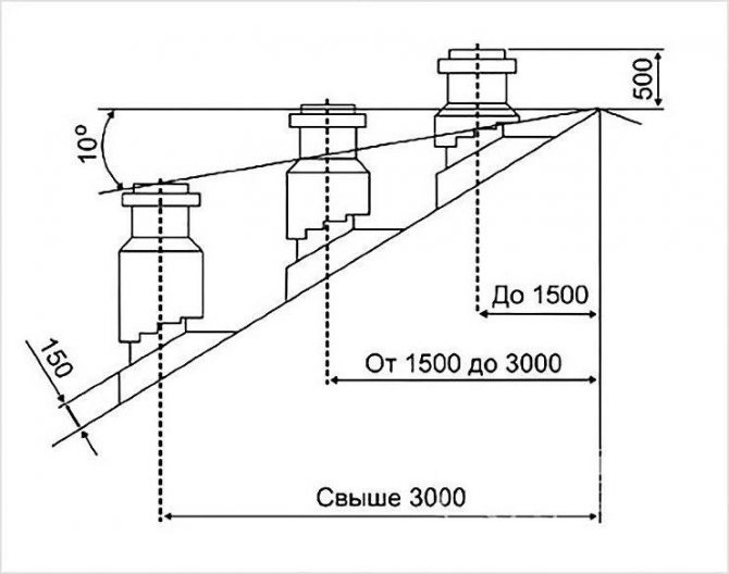 - La cheminée est située à partir de la crête du toit à une distance maximale de 1500 millimètres, ce qui signifie que la sortie du tuyau doit être située à une hauteur de 50 centimètres au-dessus de la partie supérieure de la crête;