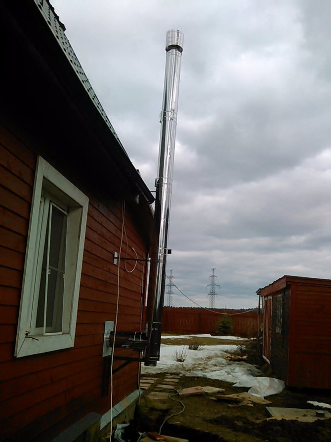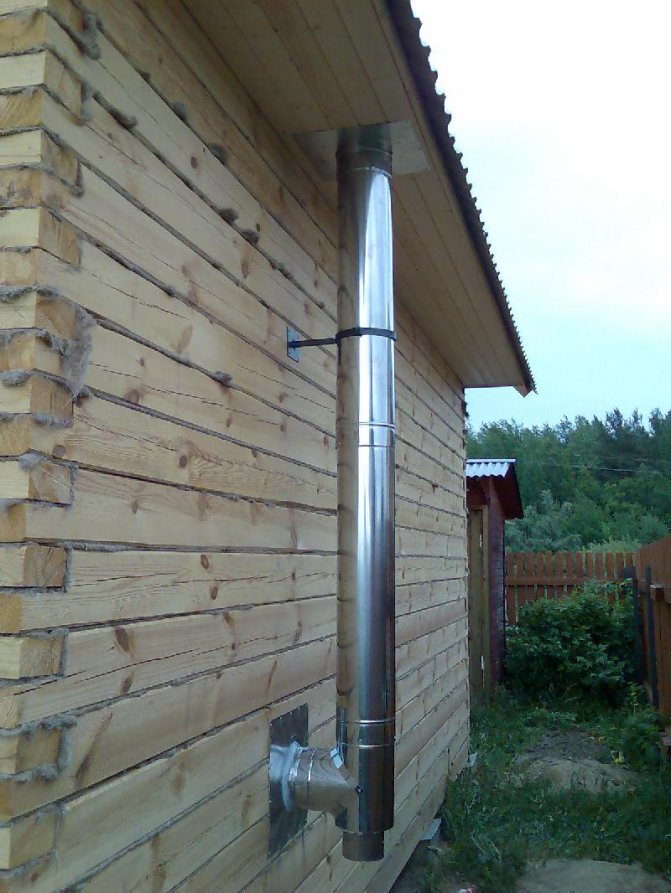 La deuxième option pour la sortie du tuyau est à travers le mur et non à travers le toit. Dans ce cas, l'extrémité de la cheminée doit être située juste en dessous du sommet du faîte du toit.