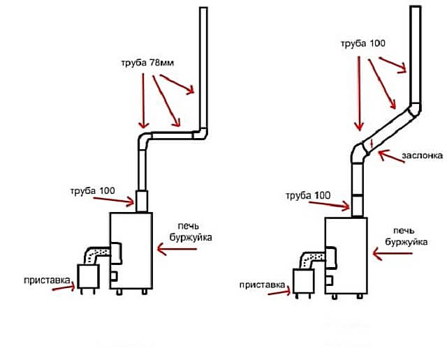 Noter! Si vous faites la même chose, mais uniquement avec l'utilisation de deux tuyaux parallèles, et non d'un seul, la poussée sera beaucoup plus puissante. Autrement dit, la vitesse de combustion du bois de chauffage et, par conséquent, le dégagement de fumée augmentera.