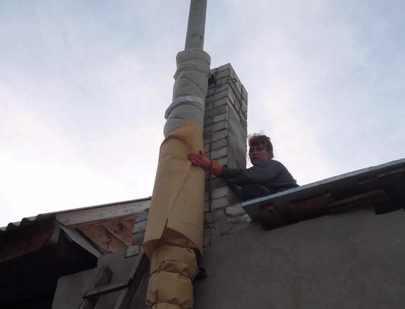 La partie extérieure de la cheminée est isolée avec une isolation thermique, recouverte d'un matériau de protection. Un champignon est installé au bout du tuyau, ce qui protégera la cheminée des débris, de la pluie, de divers petits animaux et des objets étrangers.