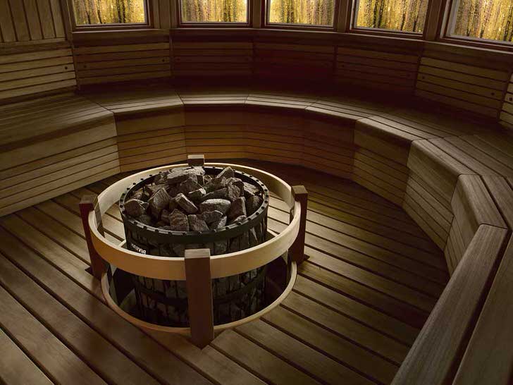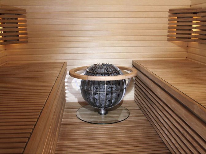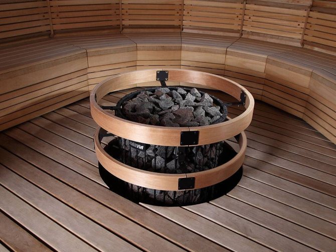 - au sol - équipé d'un élément chauffant puissant jusqu'à 30 kW et d'un volume de pierres chargées jusqu'à 240 kilogrammes, souvent installé au centre d'une grande pièce, sans préparation supplémentaire;