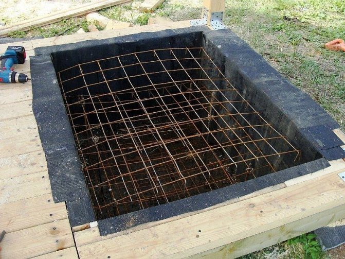 Après avoir choisi un emplacement pour le foyer, le coffrage est martelé à partir de planches de bois. La hauteur du coffrage est arbitraire. Le coffrage est réalisé sous la forme d'un carré en bois. Un deuxième carré plus petit est inséré à l'intérieur.La distance entre le coffrage intérieur et extérieur correspond aux murs de l'âtre. À l'intérieur de ce coffrage, des goupilles de renfort sont enfoncées, qui sont fixées en travers avec du fil. Le béton est coulé. Une fois le béton durci, le coffrage est retiré.