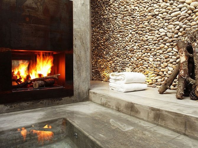 La base de la dalle pour le foyer est recommandée pour les sols difficiles avec une nappe phréatique élevée, ainsi que pour les structures massives. Lors de sa réalisation, il est nécessaire de poser un treillis de renfort dans la fosse et de le remplir d'une solution composée de 1 part de ciment et de 4 parts de gravier. Ensuite, recouvrez le béton de matériau de toiture et attendez qu'il sèche complètement.