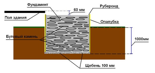 - Des moellons sont coulés, d'une épaisseur de 200 mm, remplis de mortier de ciment-sable préparé avec l'ajout de pierre concassée. Le sable et le ciment sont mélangés dans un rapport de 6: 1.