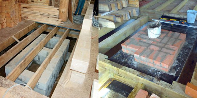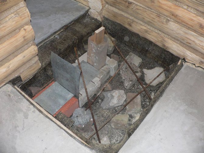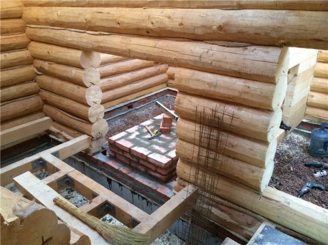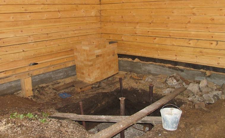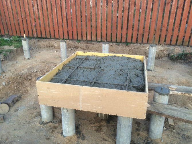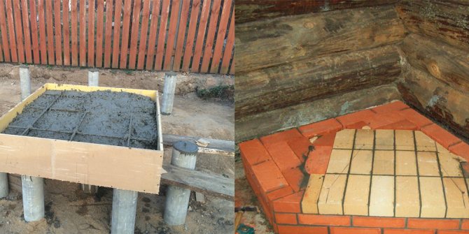 Si les fondations de la maison sont construites avec une méthode de pieux ou de piliers, il ne suffit pas d'apporter des supports supplémentaires sous le four, il est nécessaire de les attacher en une seule structure et de la remplir avec une dalle monolithe de la taille requise.