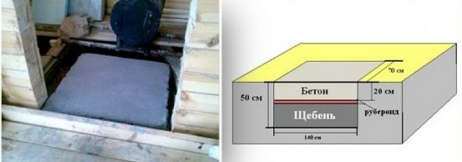 - La base en béton monolithique est considérée comme la plus populaire, elle est coulée simultanément avec la fondation principale ou en tant que structure séparée. La profondeur de pose d'une telle base pour un poêle de bain ne doit pas être grande.Par conséquent, dans la plupart des cas, une litière est faite de sable, de pierre concassée ou de gravats.