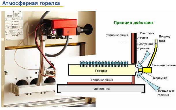 Le brûleur atmosphérique se distingue par sa simplicité de conception. L'air, nécessaire à la formation du mélange, est prélevé de manière naturelle dans la pièce où se trouve le poêle. Un composant automatique complexe n'est pas nécessaire pour que le système fonctionne. Le brûleur est non volatil. Le diagramme sur la photo ci-dessous.