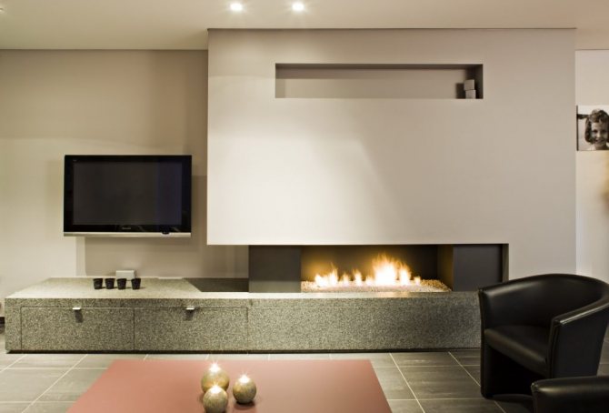 L'installation d'appareils embarqués fixes est plus difficile, mais le résultat est plus esthétique. Le panneau avant de la cheminée est au ras du mur, l'appareil ne cache pas l'espace de la pièce. Dans le mur, vous pouvez "cacher" et les communications d'approvisionnement en gaz. De plus, une telle cheminée peut être utilisée pour décorer un mur, puis la flamme peut être observée de deux voire trois côtés.