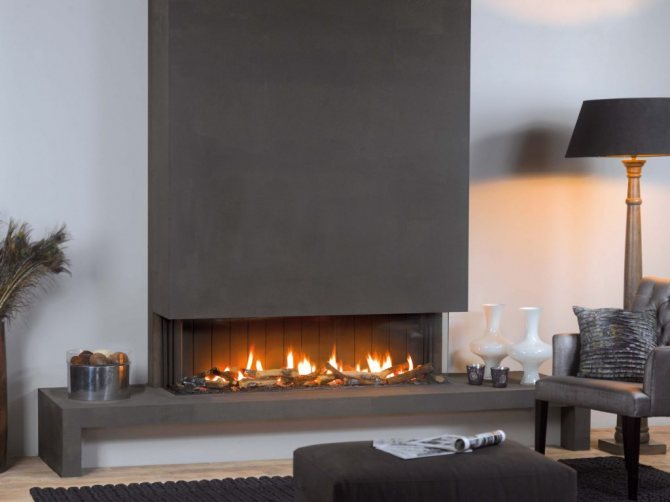 En plus des foyers fermés, il existe également des cheminées à gaz avec une chambre de combustion ouverte - dans ce cas, l'air de la pièce se réchauffe directement, entrant dans la cheminée.