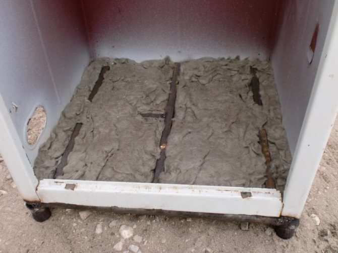 Nous déposons de la laine de basalte de 10 mm d'épaisseur sur le fond et les parois de la structure. Il est nécessaire de mettre plusieurs tuyaux sur le fond du coton pour que le coton ne se plisse pas et de mettre ensuite une feuille de métal. Il n'est pas nécessaire de poser les tuyaux sur les côtés, il suffit d'avoir une tôle galvanisée sur le dessus.