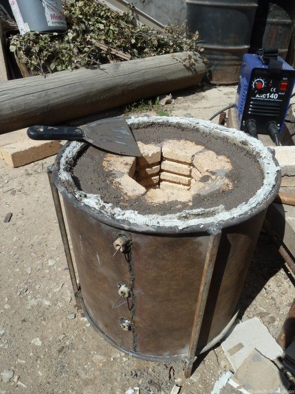 Le canon doit être gainé à l'intérieur avec des tapis haute température en 3 couches et fixé à la base avec des boutons en céramique faits maison, faire de même avec le couvercle. N'oubliez pas de faire un petit trou en bas pour un brûleur à gaz 20 x 20 cm Le couvercle a également besoin d'un trou pour que l'humidité s'évapore. En conséquence, vous devriez obtenir un four aussi simple, auquel il restera pour conduire des éléments chauffants à gaz.