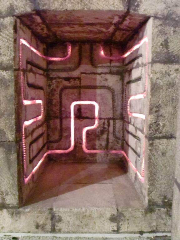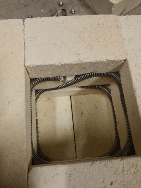 À ce stade, le four doit être laissé sécher pendant un certain temps. Après séchage, procédez à l'installation de l'élément chauffant. Pour ce faire, nous réalisons des rainures de 7 à 8 mm à l'intérieur le long des murs, car nous utiliserons une spirale du même diamètre comme élément chauffant. Lorsqu'il est chauffé, il se dilate, pour que la spirale ne sorte pas des rainures, il est nécessaire de la fixer avec un fil.