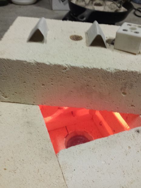 Voilà, le four est prêt à être testé. Comme on peut le constater, il n'est pas difficile de l'assembler, mais en pratique, il est très utile. L'auteur a utilisé une autre brique réfractaire comme toit. Un trou y est percé et un thermocouple est installé. Aux réglages minimum, le four chauffe jusqu'à 500oC et aux réglages maximums, il chauffe jusqu'à 1100oC. Il est très facile et pratique d'utiliser le four. Il est impératif de travailler avec des gants en matériau incombustible. Si vous devez regarder dans le four pendant le fonctionnement, vous devez déplacer la brique supérieure. Le four chauffe assez rapidement.