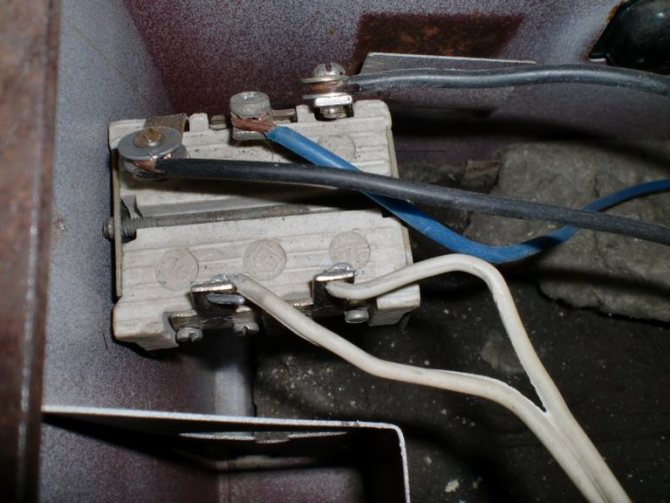 L'électricité peut maintenant être connectée au four. C'est un moment très crucial, car s'il est mal installé, l'élément chauffant brûlera immédiatement ou l'isolation des fils fondra. Pour éviter que le fil chauffant ne soit trop chaud à la jonction avec le câble, vous devez faire des boucles aux extrémités de la spirale et bien les tordre. Ensuite, nous avons besoin de boulons avec des écrous et d'un morceau de fil puissant capable de résister à un courant d'au moins 15A. Si vous en prenez moins, il peut se réchauffer, ce qui est très dangereux. Il est souhaitable que le fil soit unipolaire, il sera plus solidement fixé au point de connexion. Étant donné que le four est mis à la terre, il est préférable de choisir un câble à trois conducteurs, ou vous pouvez simplement mettre le four à la terre via un fil séparé. Les extrémités doivent être dénudées et bien serrées avec des boulons et des écrous au point de contact. Il est préférable de fixer avec deux écrous, comme sur la photo. Cela permet d'éliminer la chaleur des fils d'alimentation dans une large mesure. À ces fins, vous pouvez également acheter des contacts spéciaux avec des joints isolants en céramique.