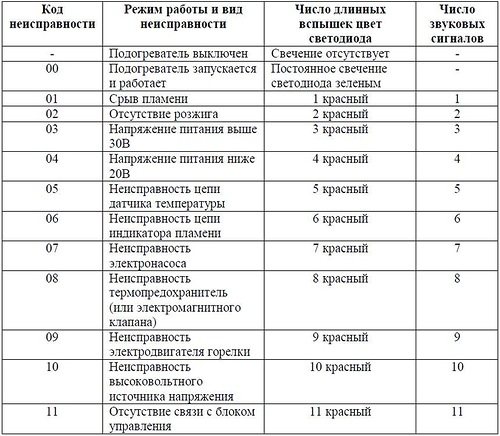 | 13 | 2 | L'appareil ne démarre pas après deux tentatives. | Il n'y a pas de carburant dans le réservoir. La qualité du carburant ne correspond pas aux conditions d'utilisation dans des conditions de gel. Manque de carburant. Tuyauterie d'admission d'air ou de gaz de combustion sale. Mauvais chauffage de la bougie de préchauffage, panne de l'unité de commande. La turbine est en contact avec la volute du ventilateur, ce qui entraîne une alimentation en air insuffisante. Le trou dans la chambre de combustion est sale (diamètre - 2,8 mm). Contamination de la maille de la bougie d'allumage ou installation incorrecte dans le raccord (pas complètement). |