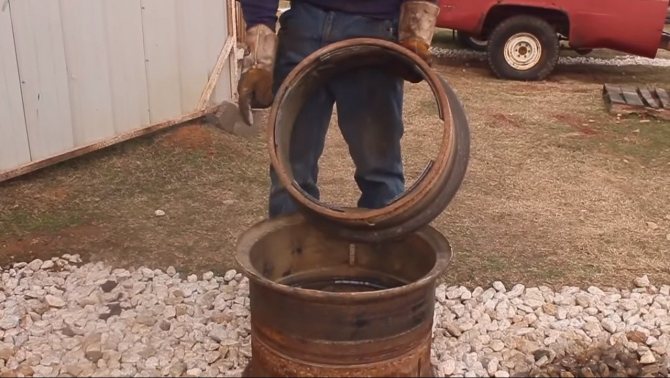 À partir des deux jantes restantes, vous devez fabriquer un appareil de chauffage et un couvercle de chambre de combustion. Le noyau est découpé dans un, le second reste intact. Les pièces sont placées les unes sur les autres et soudées ensemble de sorte que le moyeu du disque entier soit au milieu (il fonctionnera comme un treillis). D'en haut, le récipient reste ouvert - on y verse des pierres, la partie inférieure du cylindre fera office de partie supérieure de la chambre de combustion.