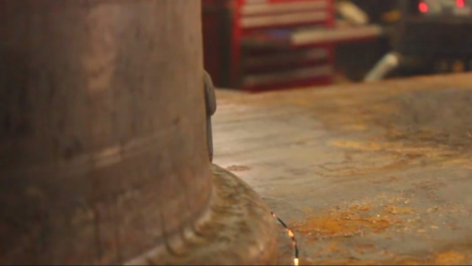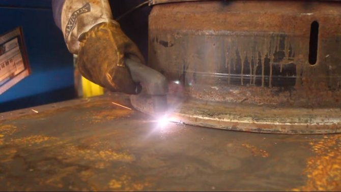 Le joint est soudé en trois passes, si possible, il est préférable de souder le poêle à partir des disques à l'aide d'un puissant modèle de soudage industriel triphasé. Il est impossible de souder efficacement du métal pour le four dans une baignoire avec un onduleur de garage d'une capacité de 2,5 kW. Dans ce cas, le corps du four n'est saisi que de points de soudure et la totalité du joint est réalisée avec une torche à acétylène.