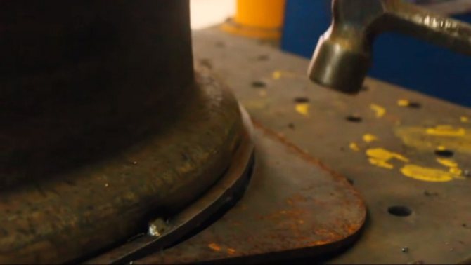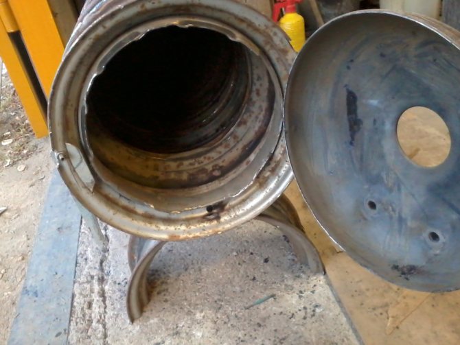 Les deux anneaux suivants sont coupés d'un côté et soudés ensemble pour former une cavité solide. Ceci est la chambre de combustion de la fournaise. Comme dans le cendrier, donc dans la chambre de combustion dans la paroi du disque, il est nécessaire de découper une trappe pour charger du bois de chauffage ou une briquette.