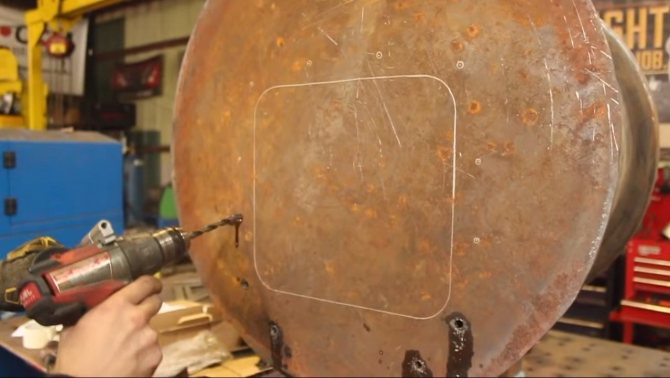 Après le soudage, des trous sont percés dans la partie supérieure et au fond de la cuve le long du diamètre de la cheminée. Il traversera tout le réservoir, devrait chevaucher étroitement les parois et sortir par le bas.Dans le côté du réservoir tout en bas, un tube mince est installé à un angle par rapport au sol et fermé avec un robinet pour drainer eau chaude.
