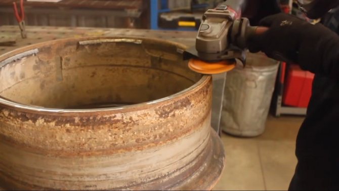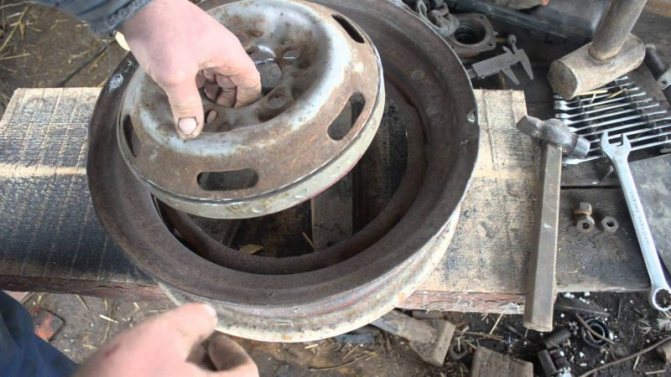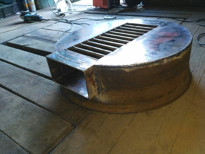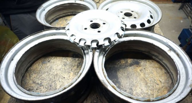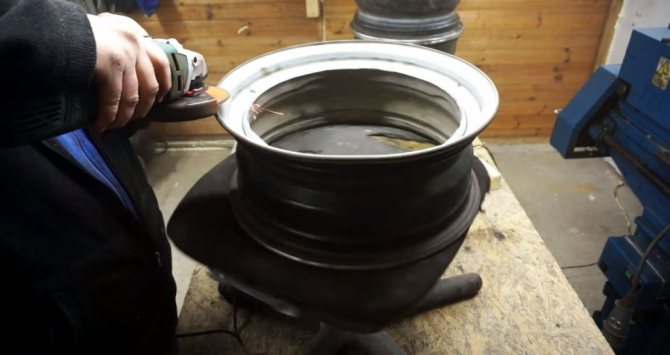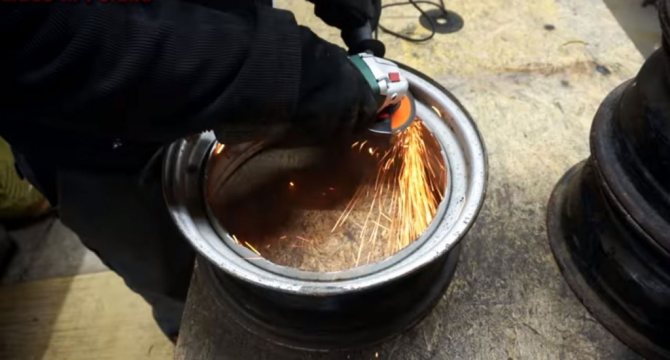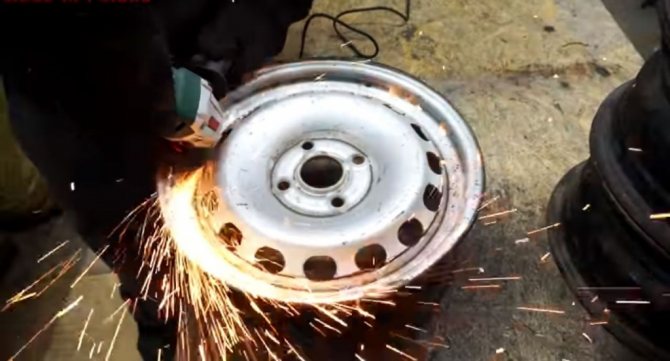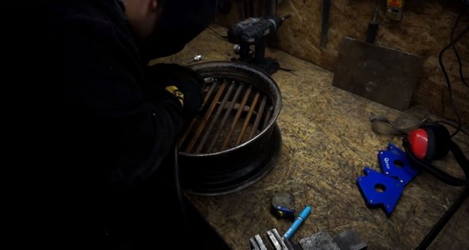 Deux sont laissés inchangés, le troisième est soumis à un rognage supplémentaire et la paroi de la bride est retirée. Pour faire simple, il faut découper le fond du disque avec un cutter à oxygène ou un broyeur puissant, en ne laissant que la jante. Une grille métallique de la grille est placée à l'intérieur du rebord et soudée aux parois du disque.