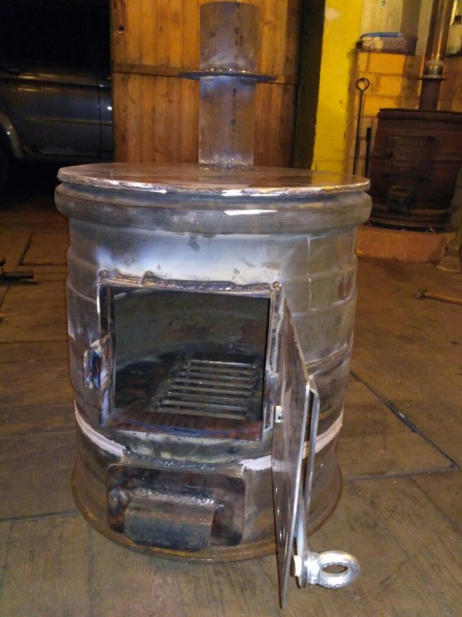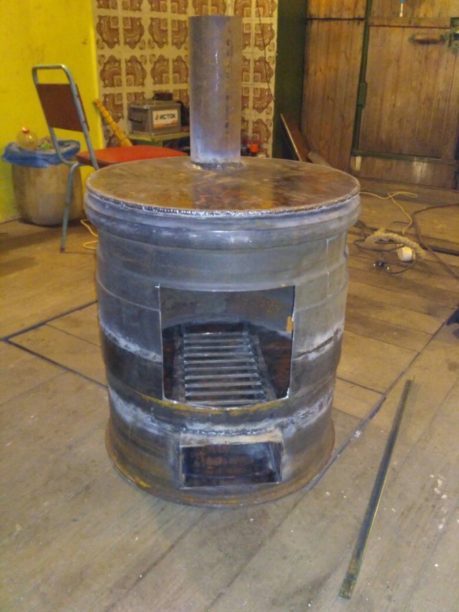 - Chambre de combustion de type baril. Le corps du four est soudé à partir de trois bords et monté horizontalement. Ce modèle est pratique pour charger du matériel à partir d'un dressing ou de toute autre buanderie.