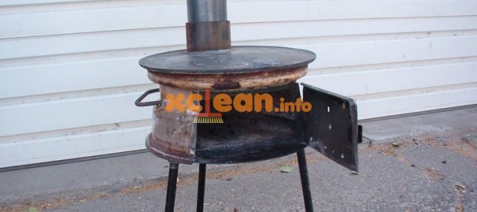 Il existe différents modèles d'un tel poêle, mais il est plus pratique d'utiliser celui qui est composé de trois disques. Placez ensuite la grande vaisselle au dos du disque. Pour éliminer la fumée, un tuyau est installé. Cela entraîne une faible perte de chaleur, mais élimine la fumée corrosive pour les yeux.