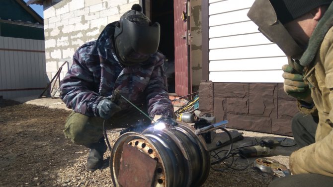 Tout d'abord, il est nécessaire de souder le premier disque sur une feuille de fer, qui doit être de plus grande taille que le disque. Cela est nécessaire pour que les charbons tombés n'endommagent pas la pièce pendant le chauffage, mais si le poêle à partir des jantes fonctionne dans la rue, cette action n'est plus nécessaire.