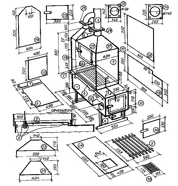 D'après le dessin, les éléments du four sont marqués, qui sont découpés d'une manière correspondant à l'épaisseur du métal. Les détails sont marqués sur des tôles : parois, fond et plaque de cuisson.