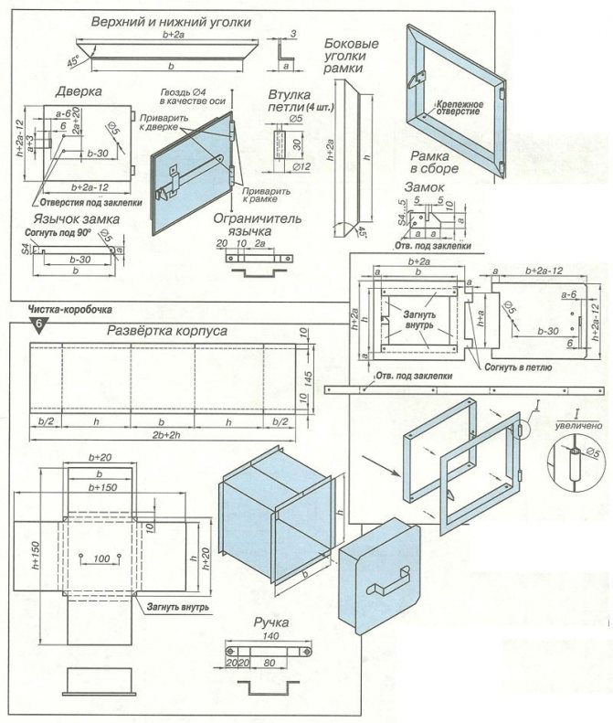 Selon le dessin, la porte du foyer est fabriquée. Elle est découpée dans de la tôle d'acier, prévue pour des pattes d'accrochage et des dispositifs de fixation en position fermée. Les éléments d'accouplement sont soudés sur le mur.