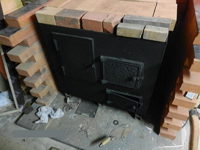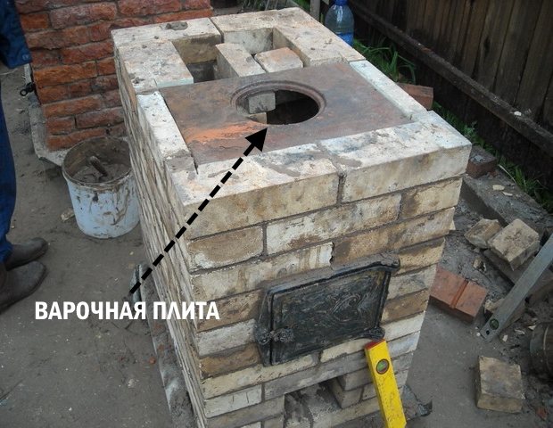 Ensuite, la brique est posée selon la commande. Après son achèvement, la paroi latérale et le couvercle de la fournaise sont installés, dans lesquels un tuyau de dérivation est installé pour l'installation d'une cheminée.