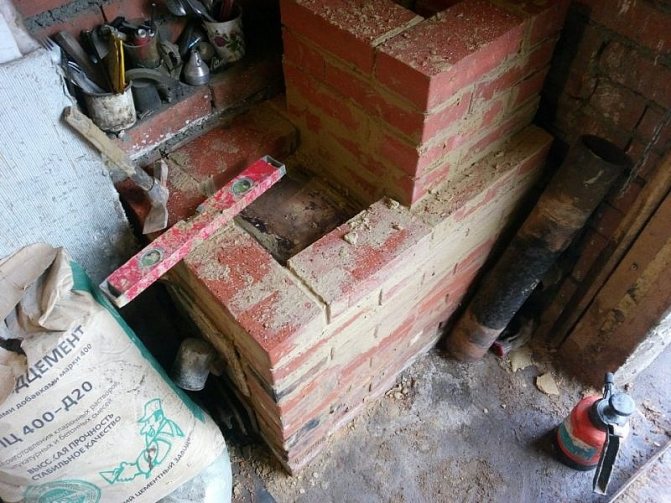 - Ensuite, nous mettons la cheminée dans le quadruple, que nous joignons à celle en métal. Le tuyau doit être strictement vertical et ne pas se plier sur le côté. Pour une plus grande stabilité, il doit être recouvert de trois rangées de briques.