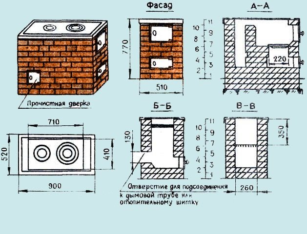 Ci-dessous, nous verrons comment plier un poêle en brique de vos propres mains. Le dessin et les dimensions sont visibles sur la photo #1 :