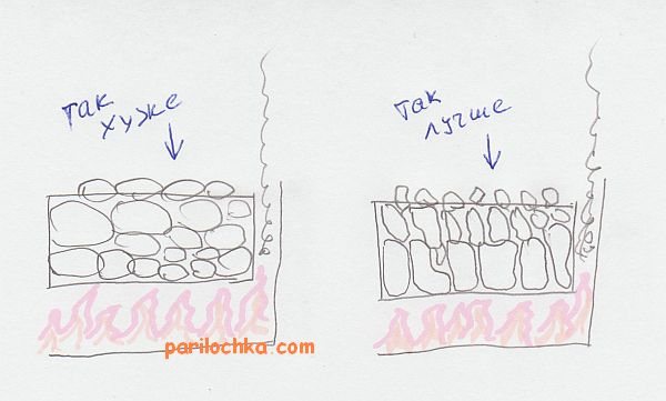*** Donc, pour résumer ce qui a été dit: mettre correctement des pierres dans le poêle du sauna, c'est les mettre en ordre décroissant du plus grand (10-12 cm) au plus petit (5-6 cm), et de la couche inférieure doit nécessairement "respirer", c'est-à-dire qu'il faut laisser un peu plus d'espace libre entre les pierres.